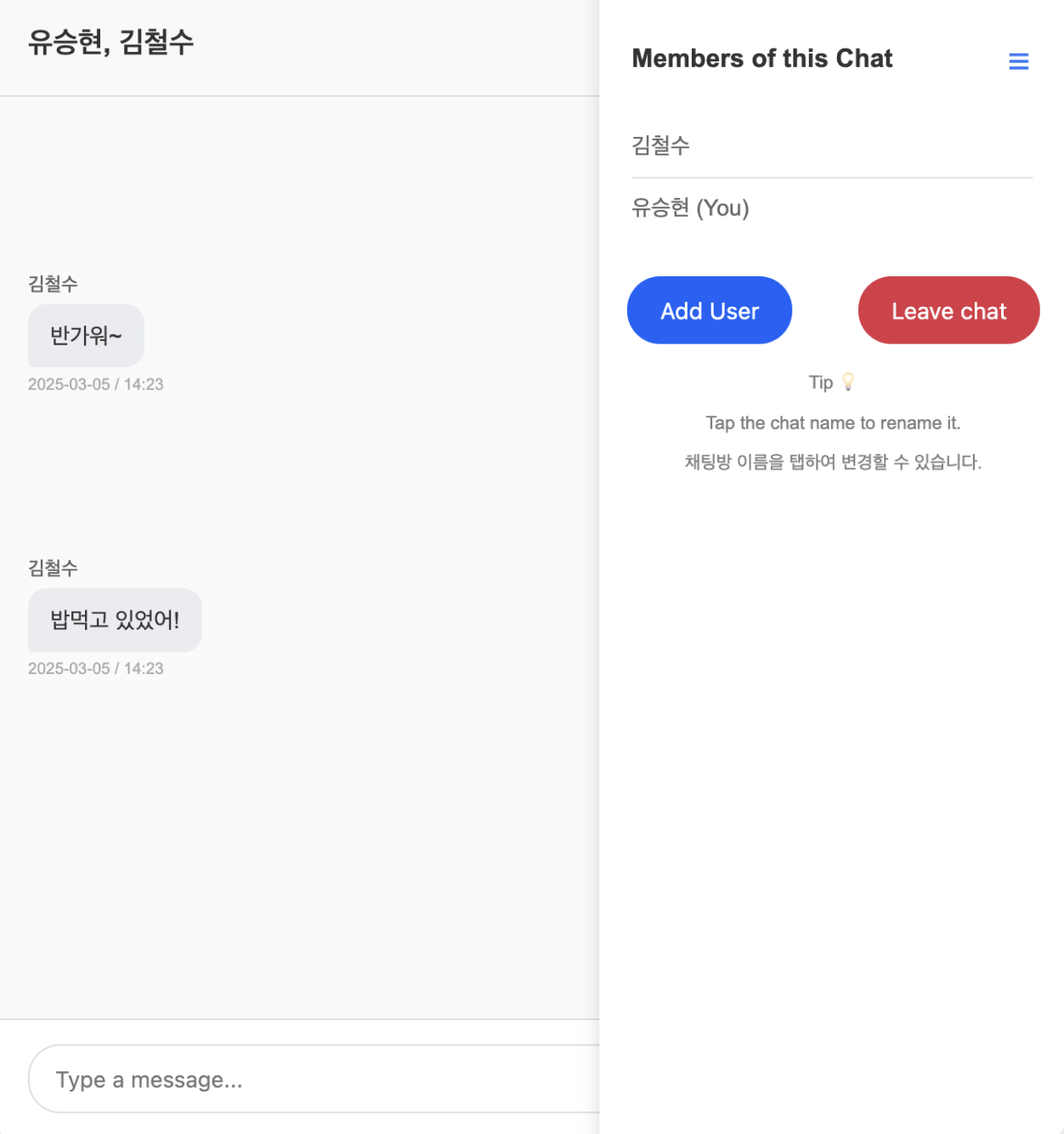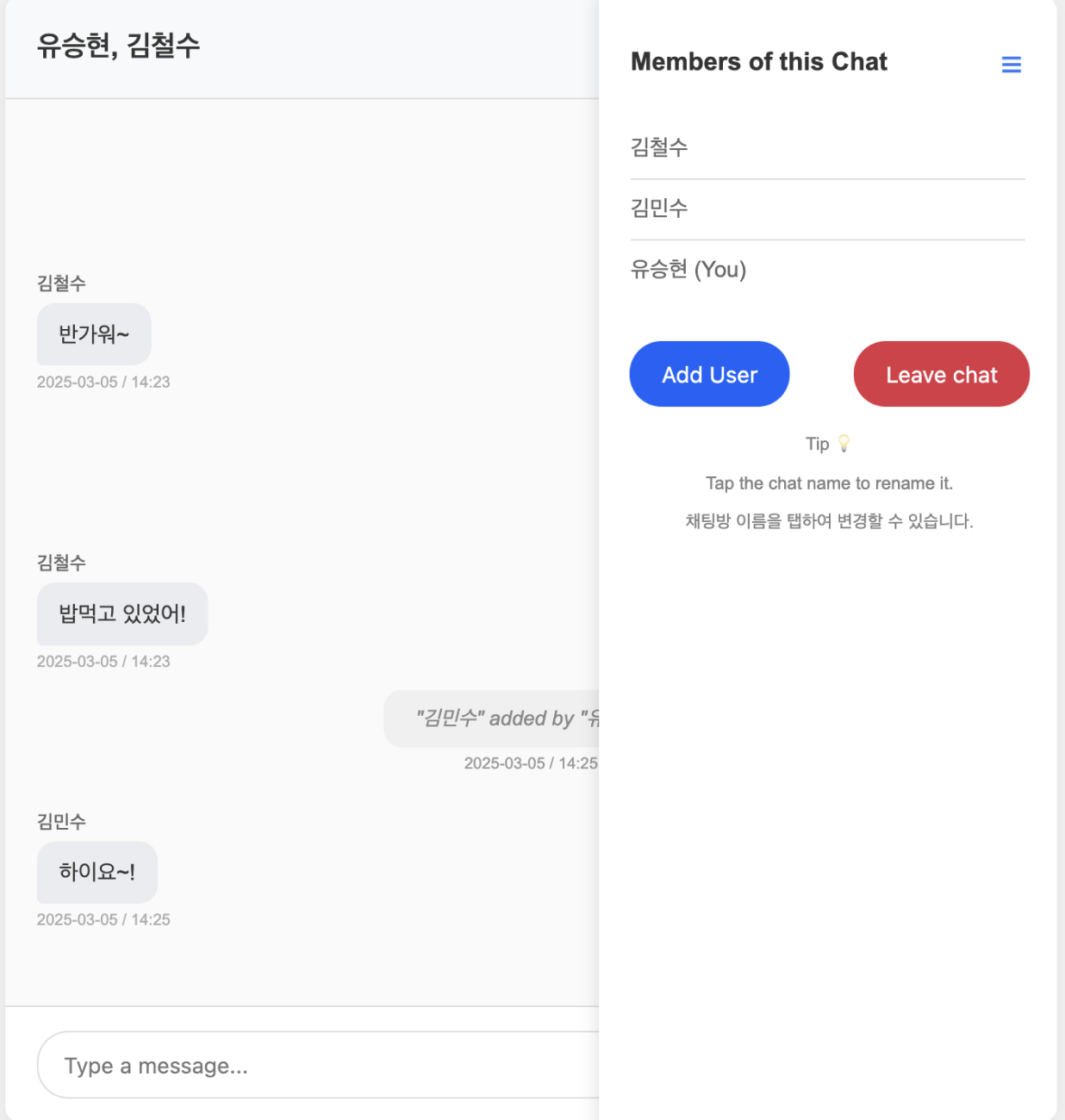 오른쪽 위 메뉴를 누르면 해당 채팅방에 있는 유저 목록을 확인할 수 있다. 또한, 그룹 채팅을 위해 “Add User” 기능을 추가하여 새로운 사용자를 초대할 수 있도록 했다. "Leave chat" 클릭시 채팅방을 나갈 수 있다.