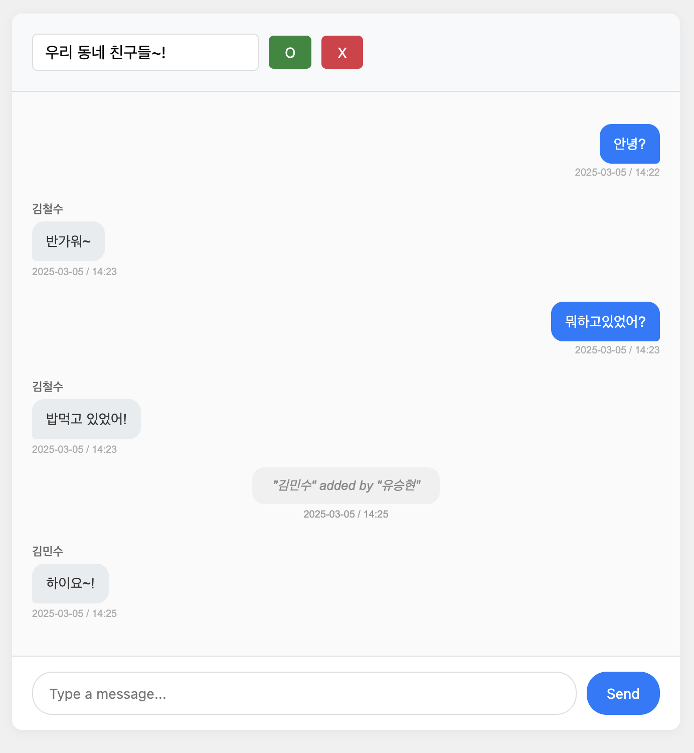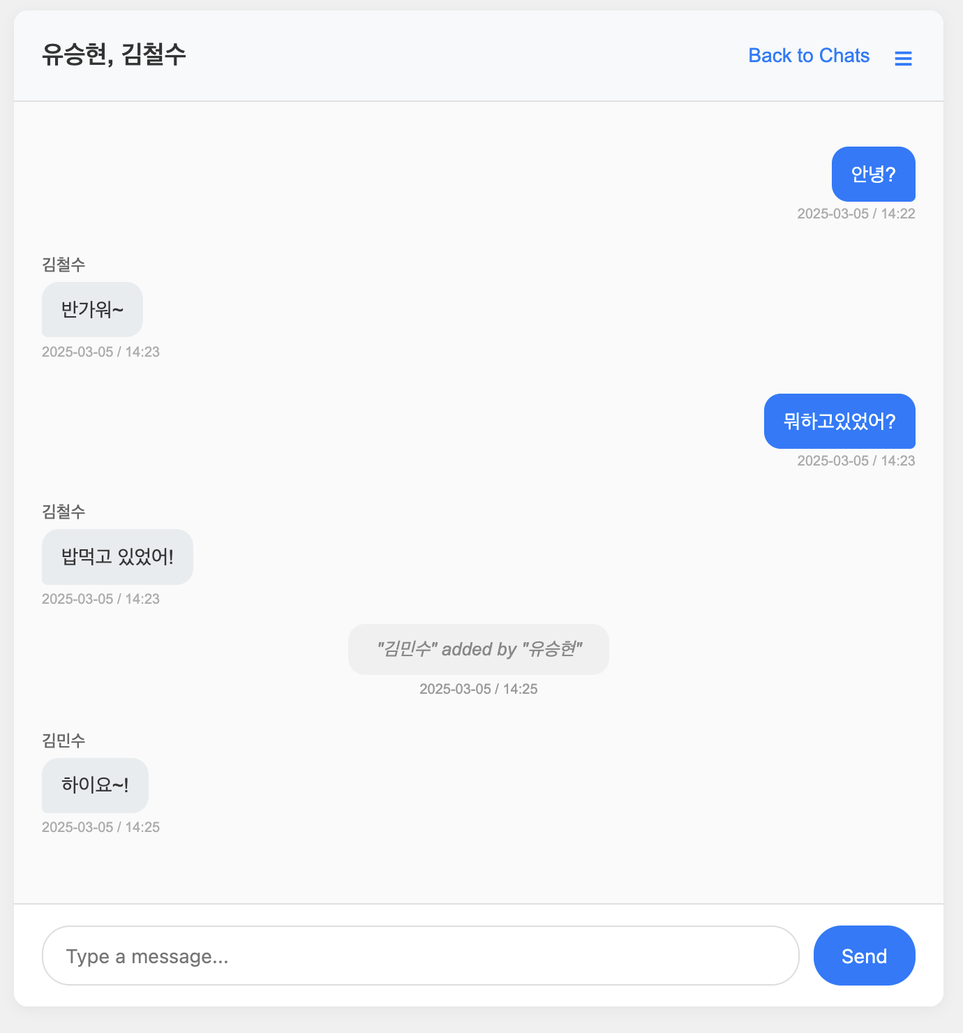 채팅방에 유저가 추가되면, 시스템 메시지를 통해 누가 언제 누구를 추가했는지 표시된다. 추가된 유저는 즉시 채팅에 참여할 수 있다.