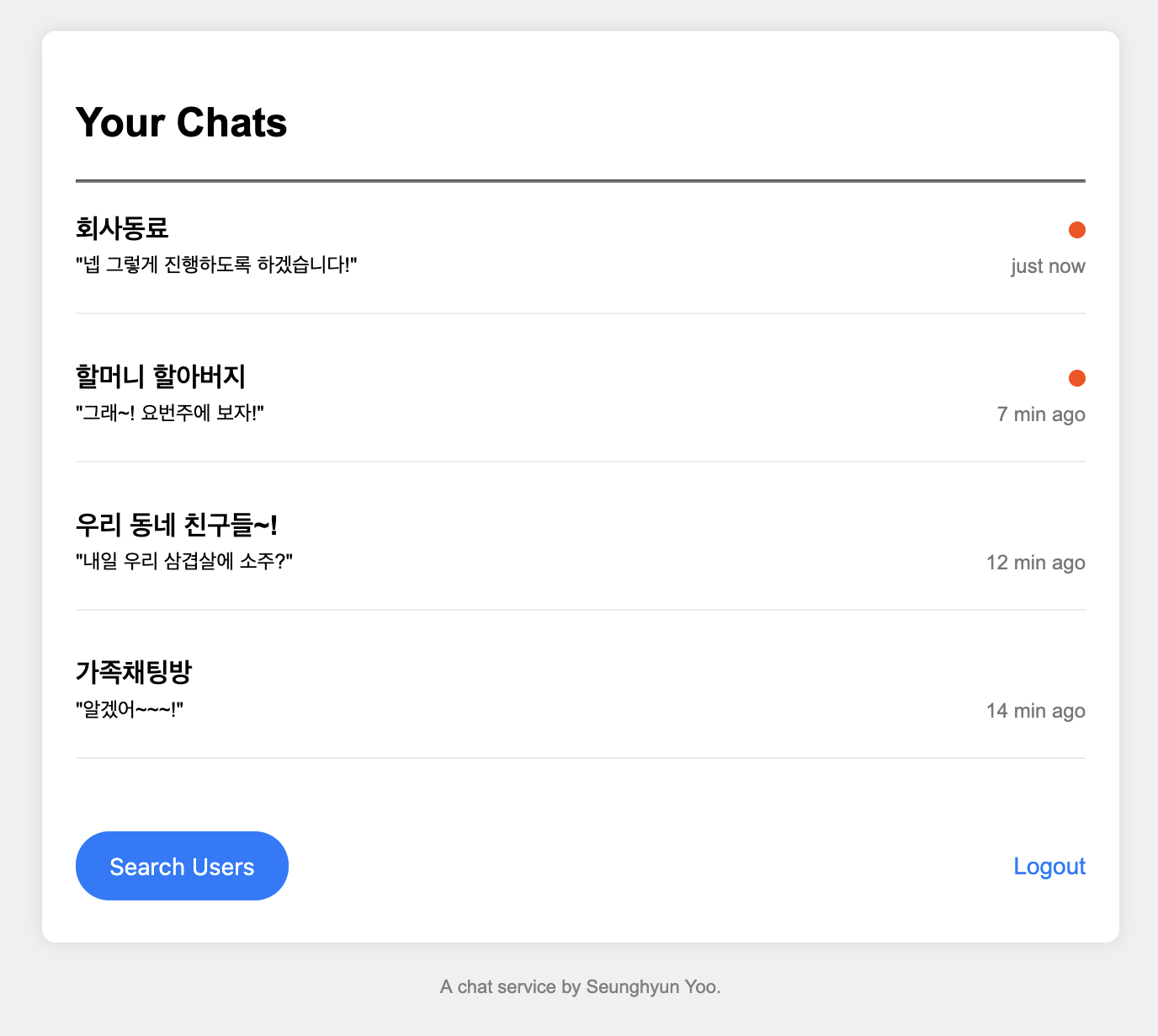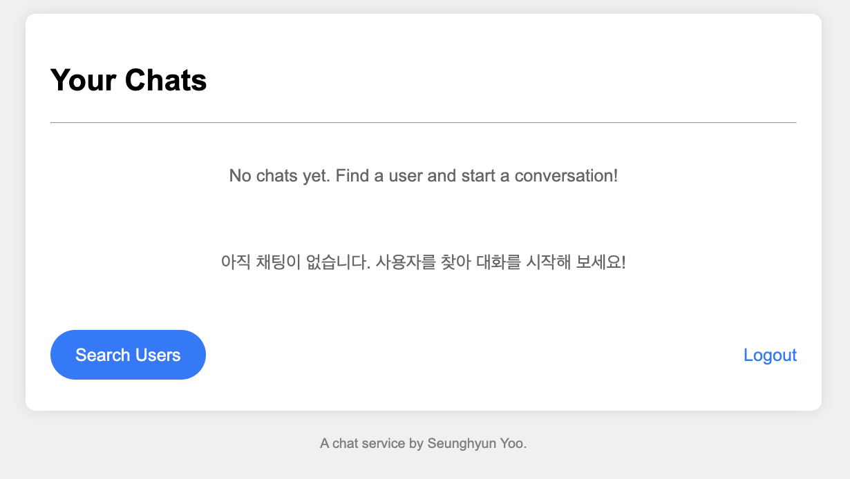 로그인 후 처음 나오는 화면이다 여기서 채팅목록을 확인할 수 있고 Search User를 통해 유저를 검색해 새로운 채팅방을 만들 수 있다.