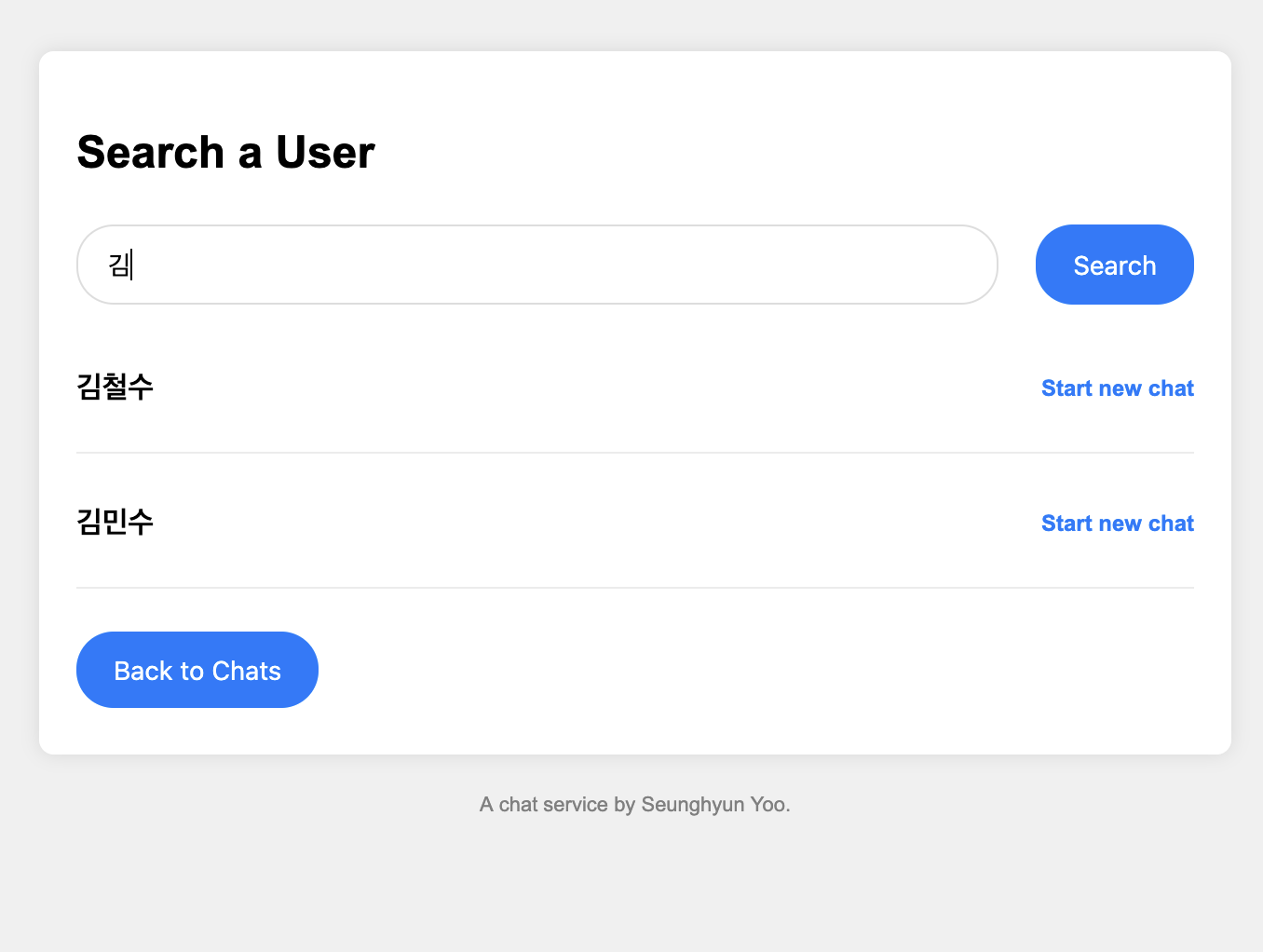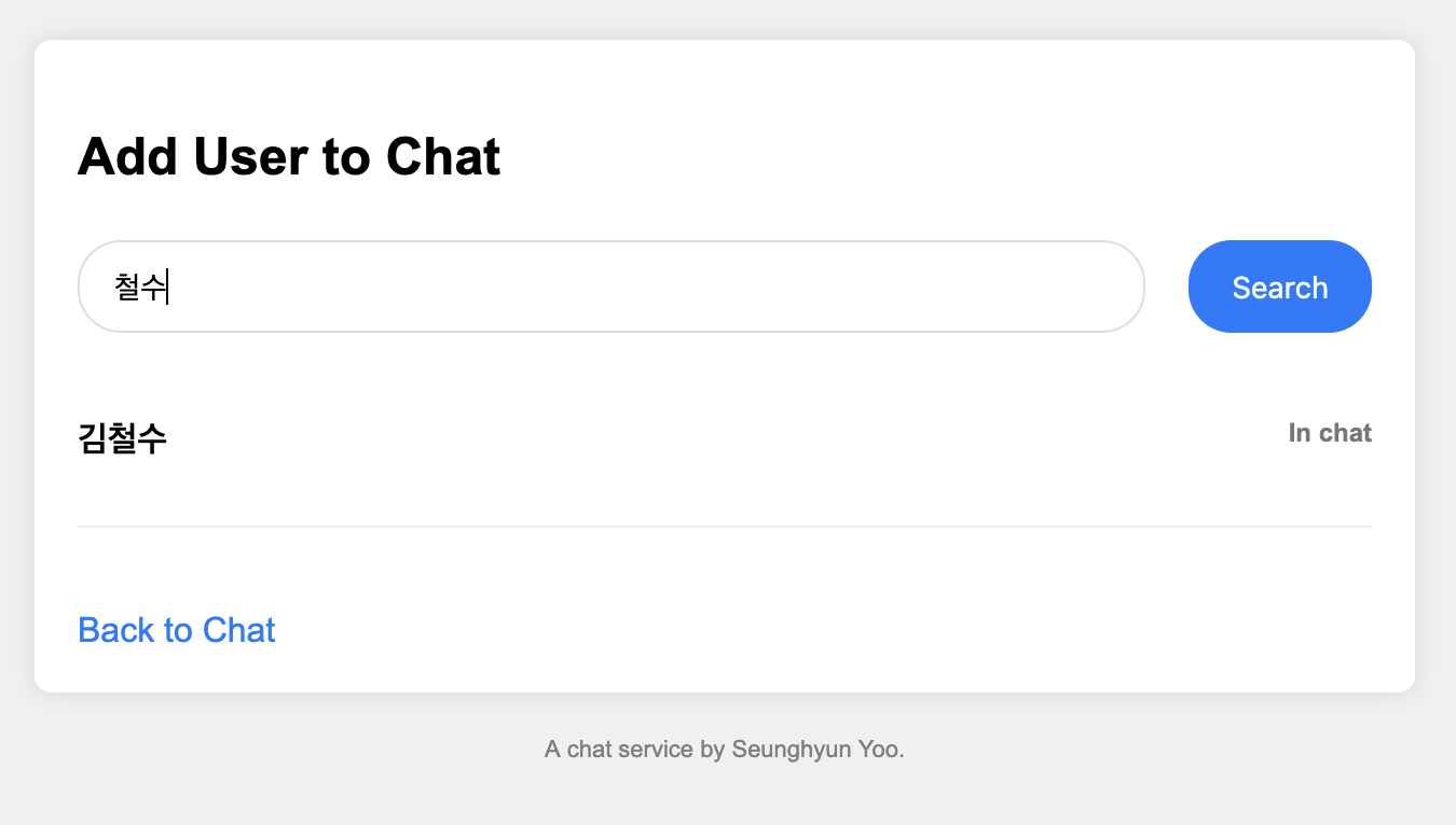 Search User를 클릭했을 때 나오는 화면이다. 여기서 유저를 검색할 수 있고 그리고 Start new chat버튼을 이용해 그 유저와 채팅방을 만들 수 있다