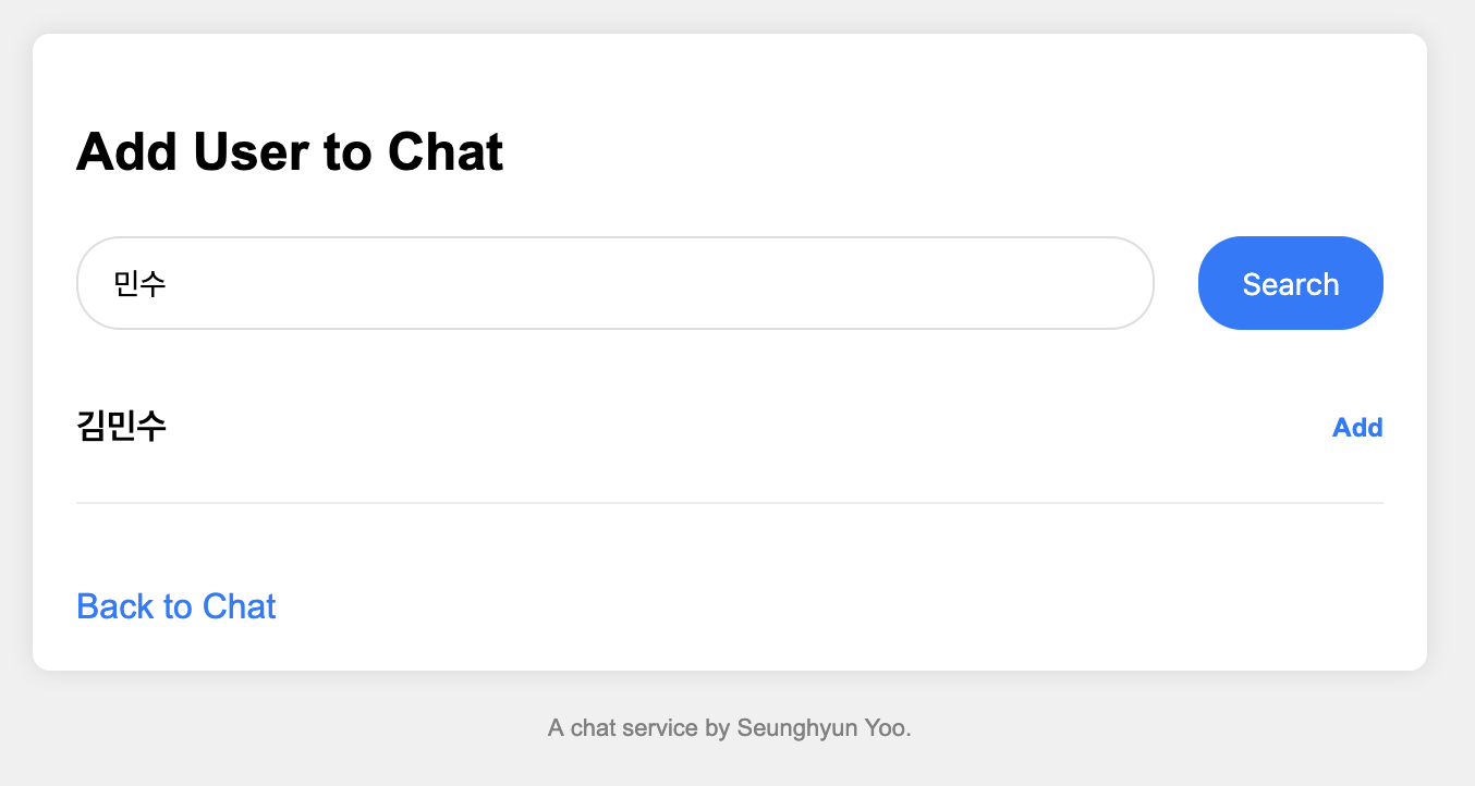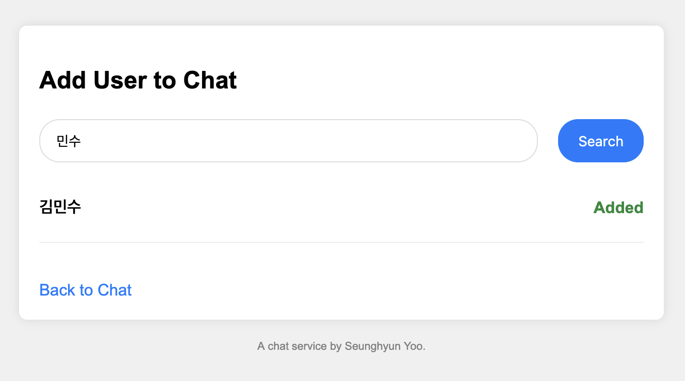 “Add” 버튼을 누르게되면 유저가 해당 채팅방에 추가되고 “Added” 라고 초록색으로 바뀐다.